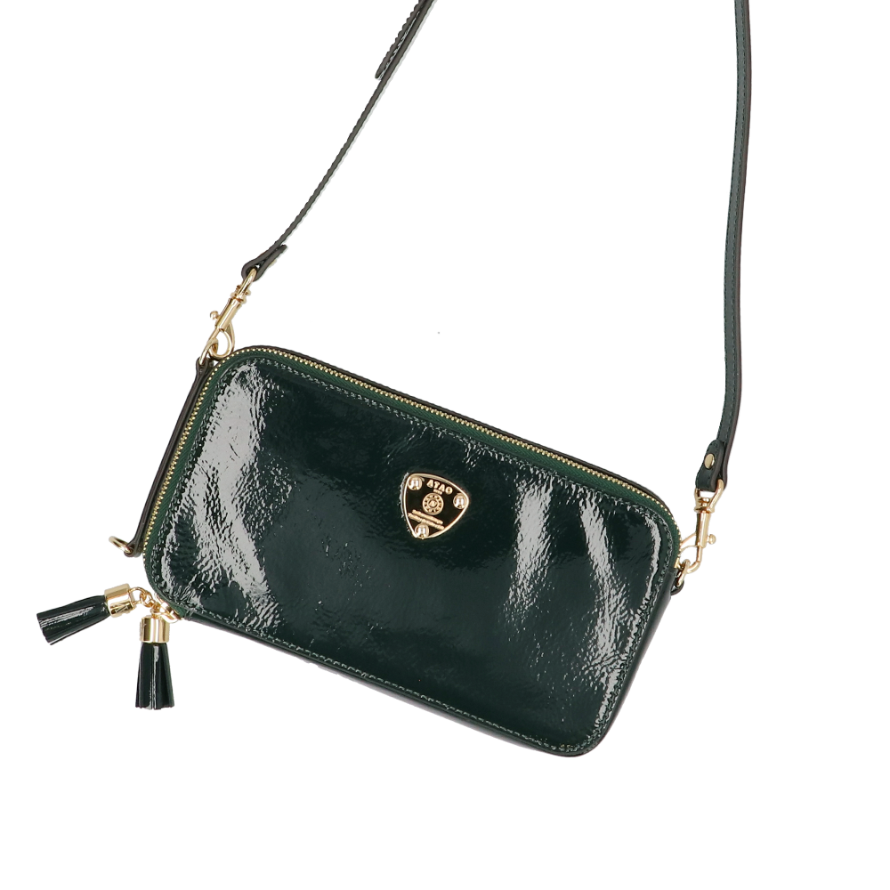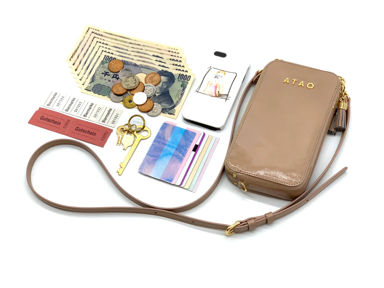 ATAO(アタオ)(あたお)の大切な貴重品を守るという意味を込め名付けられたお財布ポシェット(スマホポシェット『アミュレット』。(ウォレットポシェット)(モバイルバッグ)(スマホポシェット)思いやりや優しさを育むと言われる『ローズクォーツ』、勝利を呼び幸福をもたらす『ルビー』、愛と献身を意味する『エメラルドグリーン』、長寿や健康を意味する『パールグレージュ』の全4色。(エナメルレザー)(カウレザー)(牛革素材)(肩がけ)(斜め掛け)(ショルダーバッグ)(ミニバッグ)(マイクロバッグ)(クラッチバッグ)(あみゅれっと)(お財布スマホポシェット)(モバイルポシェット)(スマホショルダー)