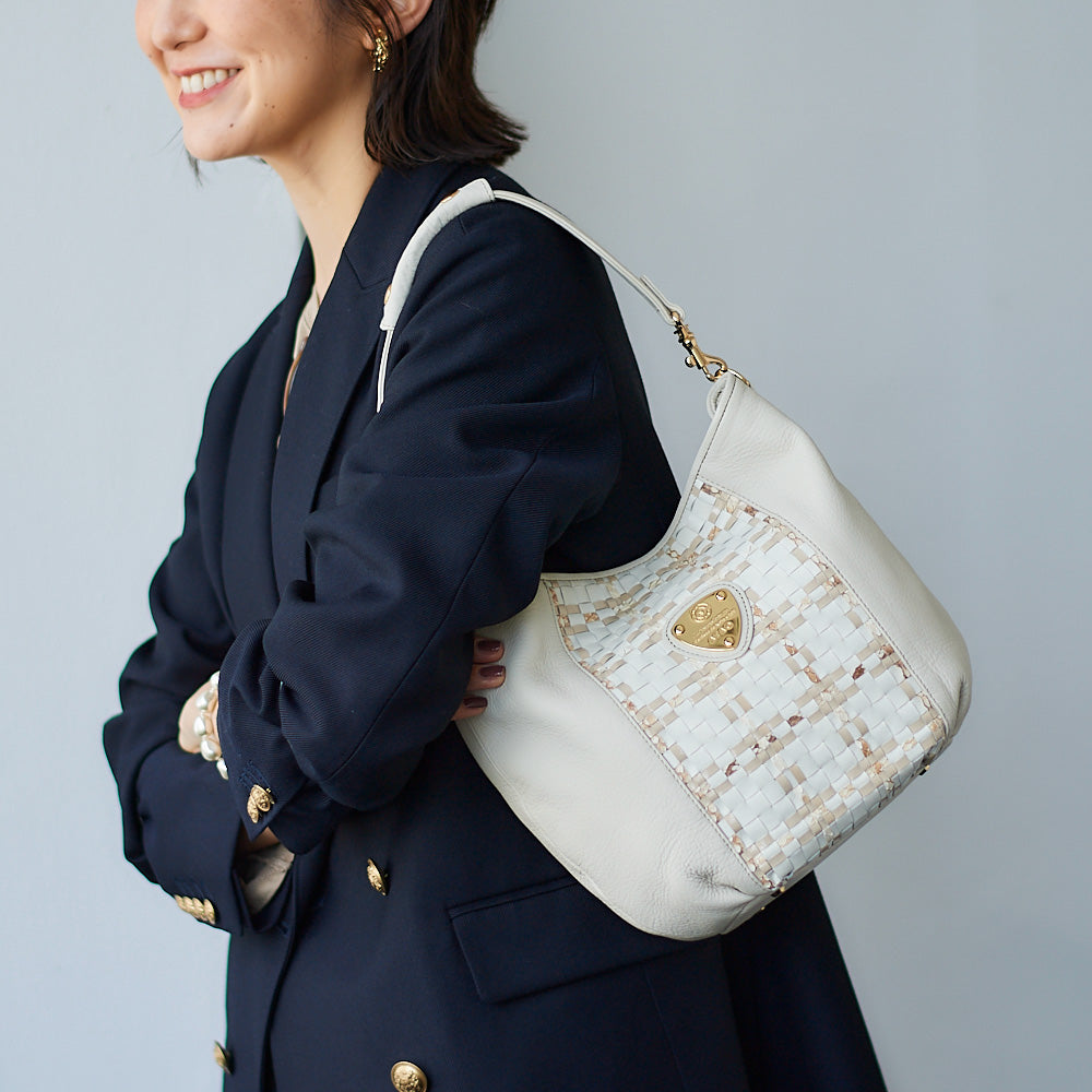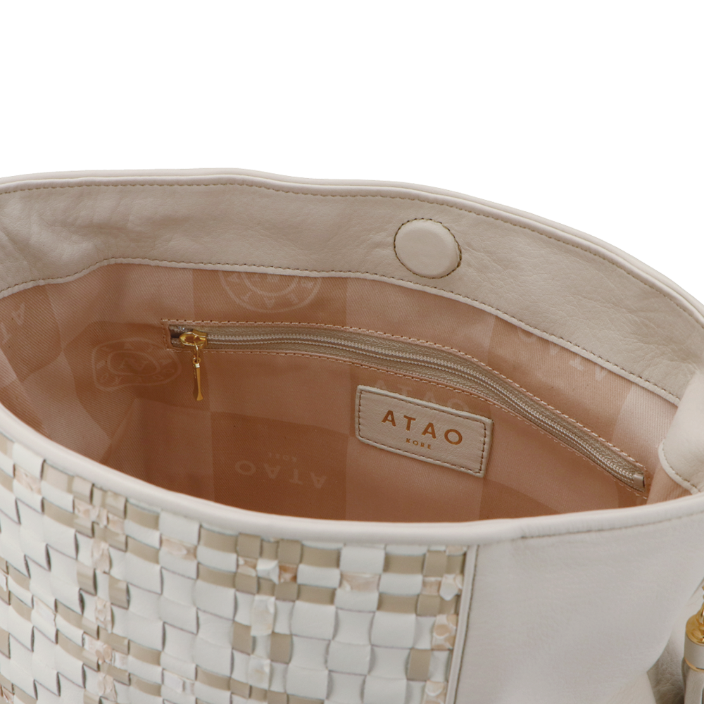 ATAO(アタオ)(あたお)の記念すべき5周年を記念して誕生した3つの異なる素材を編み込んだ素材”ルーク”シリーズに、ATAOの中でも根強い人気を誇るミディアムバッグ『キャンディ』が仲間入り。パイソン、エナメル、スムースレザーを、熟練の職人がじっくりと時間をかけてお作りしたこだわりの逸品。(ハンドバッグ)(ミディアムバッグ)(ミドルバッグ)(ショルダーバッグ)(肩がけ)(ワンショルダー)(ワンマイルバッグ)(カウレザー)(牛革素材)(キャンディ)(ルーク)
