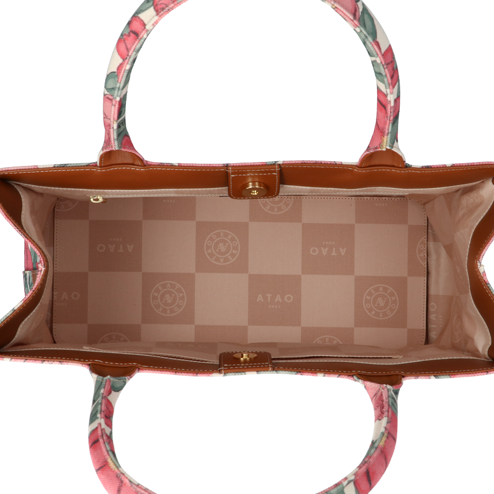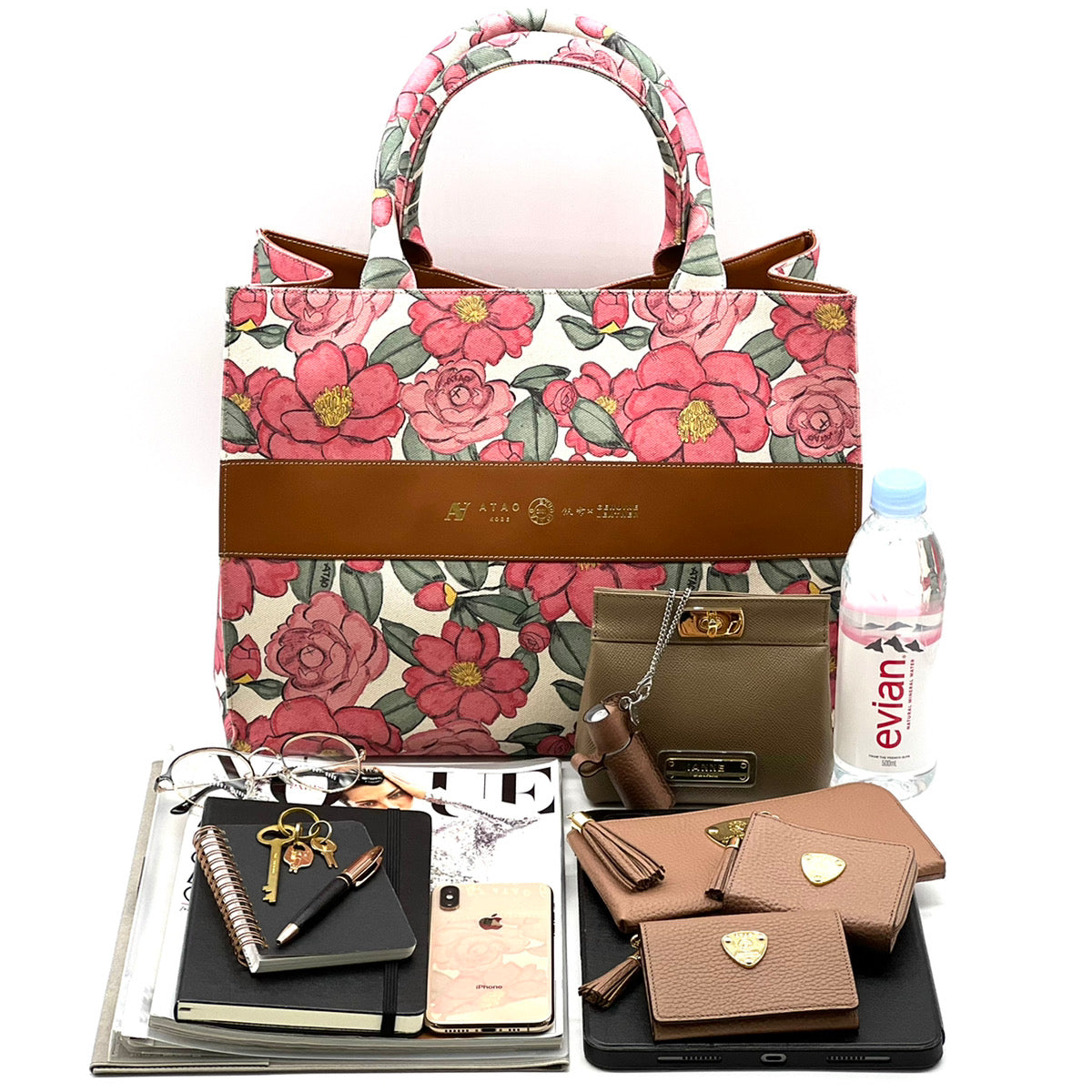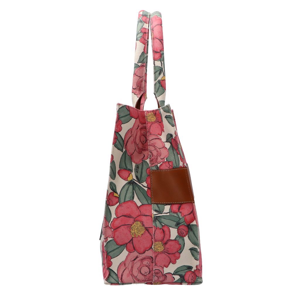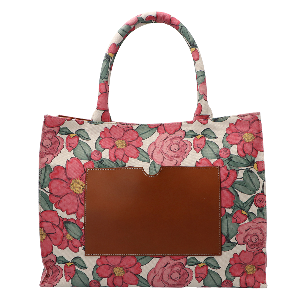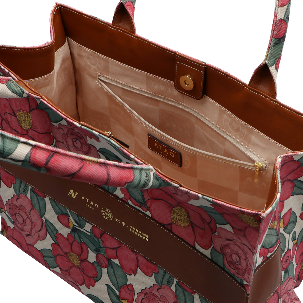 ATAO(アタオ)が咲かせる大輪の「サザンカ」が新たな物語を刻む。「Camellia sasanqua(カメリアサザンカ)」。サザンカは神戸を象徴するシンボルツリー。神戸ブランドATAOにふさわしい花と言えます。ATAOのデザイナーが描いた鮮やかなサザンカのアートを、職人による繊細な色付けでバッグというスクリーンに表現した「Cinema(シネマ)」。この新たなテキスタイルからATAOの新しい物語が始まろうとしています。(A4バッグ)