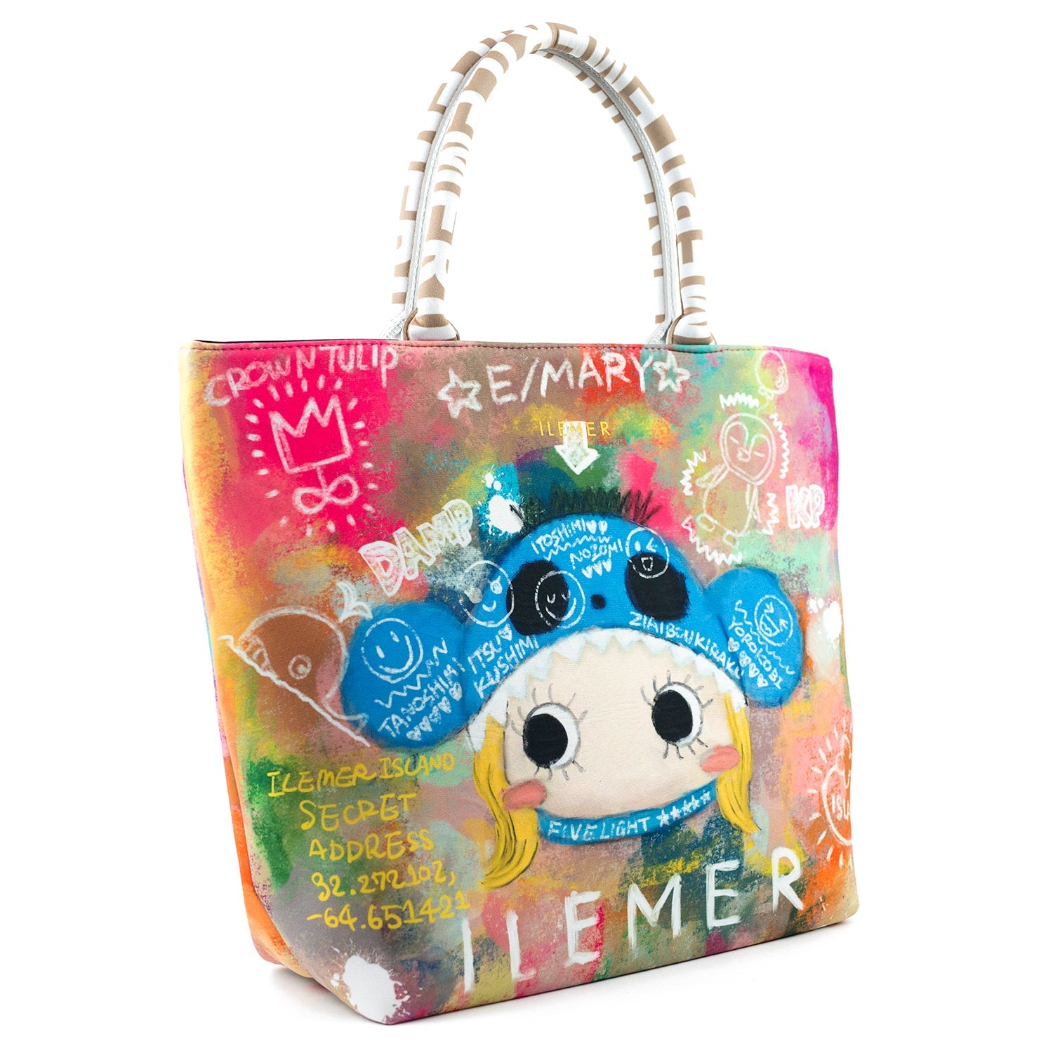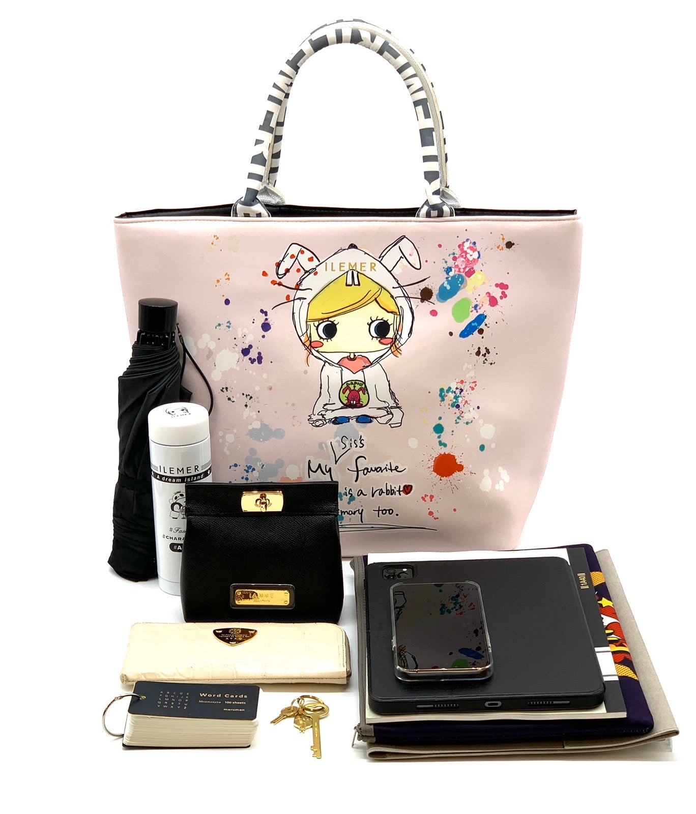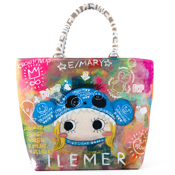 非常に軽くて柔らかい人気のエアリートート「LUNLUN」。(ルンルン)(るんるん)(トートバッグ)(肩がけ)(ワンショルダー)ウエットスーツに使用されるネオプレーン素材に手書きのILEMER(イルメール)(いるめーる)オリジナルのイラストがプリントされたトートバッグ。(イーマリー)(カラフル)