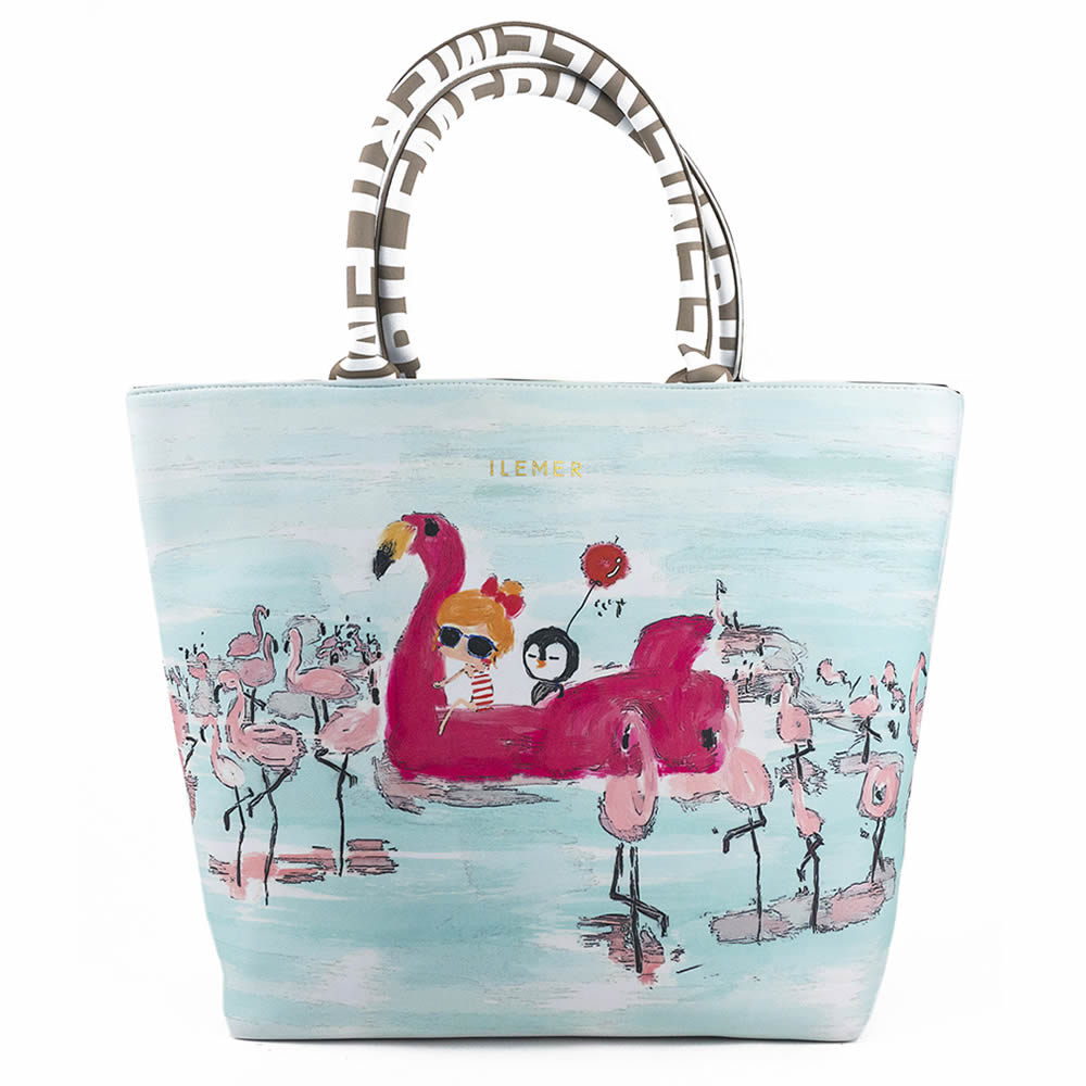 非常に軽くて柔らかい人気のエアリートート「LUNLUN」。(ルンルン)(るんるん)(トートバッグ)(肩がけ)(ワンショルダー)ウエットスーツに使用されるネオプレーン素材に手書きのILEMER(イルメール)オリジナルのイラストがプリントされたトートバッグ。(イーマリー)(フラミンゴ)(皇帝ペンギンKP)(ケーピー)(水色)(ブルー)