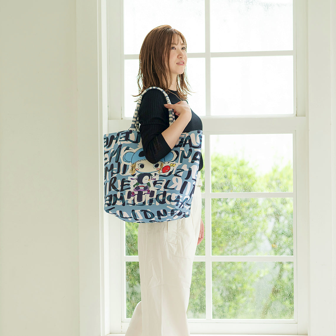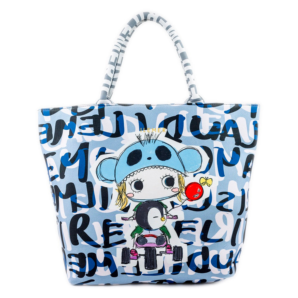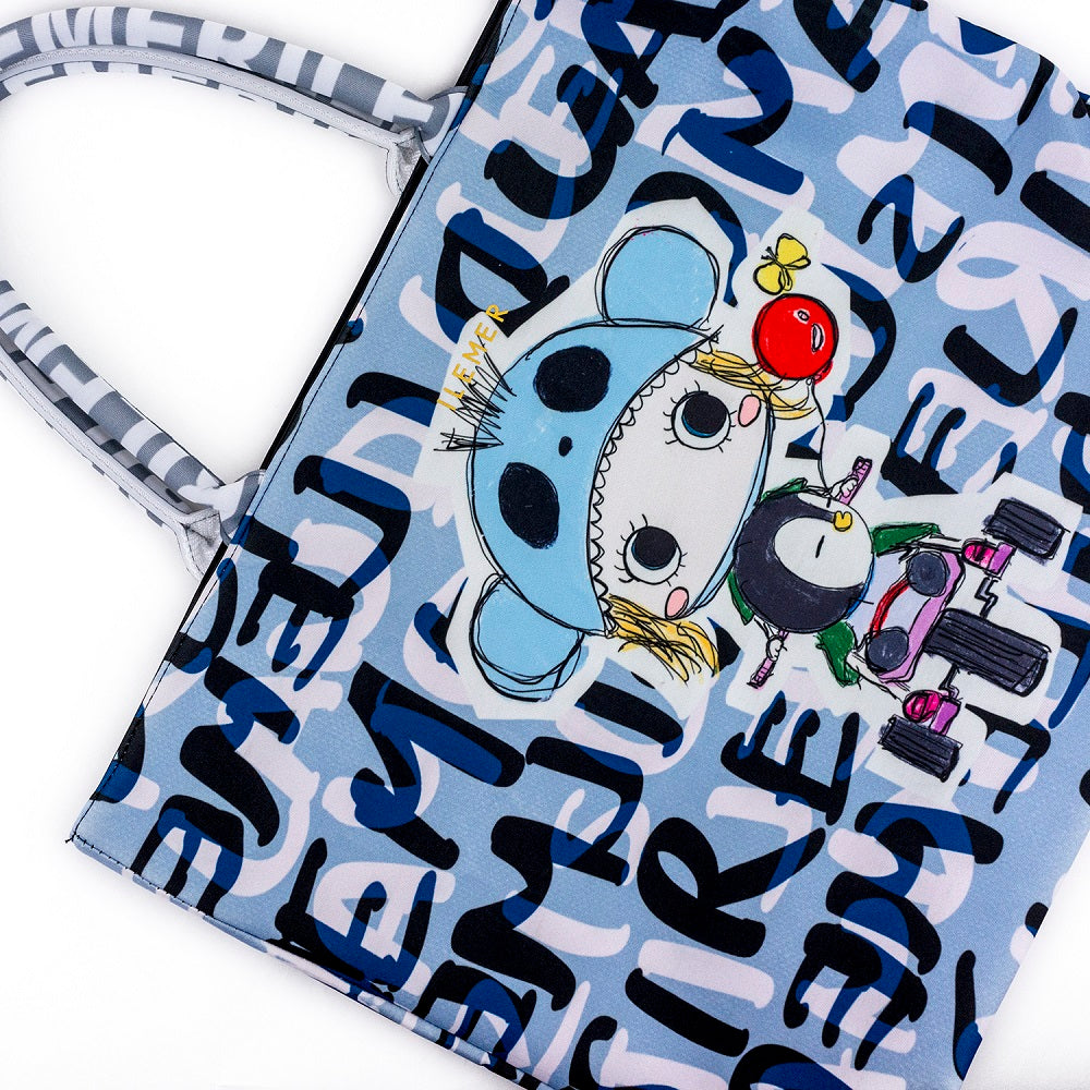 非常に軽くて柔らかい人気のエアリートート「LUNLUN」。(ルンルン)(るんるん)(ワンショルダー)(肩がけ)(トートバッグ)ウエットスーツに使用されるネオプレーン素材に手書きのILEMER(イルメール)(いるめーる)オリジナルのイラストがプリントされたトートバッグ。(イーマリー)(皇帝ペンギンKP)(ケーピー)(ブルー)(水色)