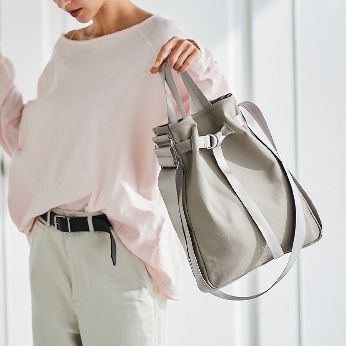 サブもメインも二役こなせるファブリックバッグ「マルゴ」。IANNEにも軽やかなファブリックバッグが登場。空気のようにふわっと軽やかなテキスタイルに繊細な光沢が上品なハンドル。フロントベルトはきっちりしめてもラフに垂らしても、バッグの口はきゅっと絞っても広げても、どんな表情も可愛く決まります。何かと荷物が増える夏には日傘にカーデ?飲み物など、嵩張る荷物もたっぷり収納できる安心のサイズ感。ハンドル持ちでスマホショルダーと2個持ちも、ハンドルをしまって斜め掛けやワンショルダーでも好みのスタイルをお楽しみください。絶妙なニュアンスカラーがインポートチックなパリのエッセンス感じるファブリックトートです。