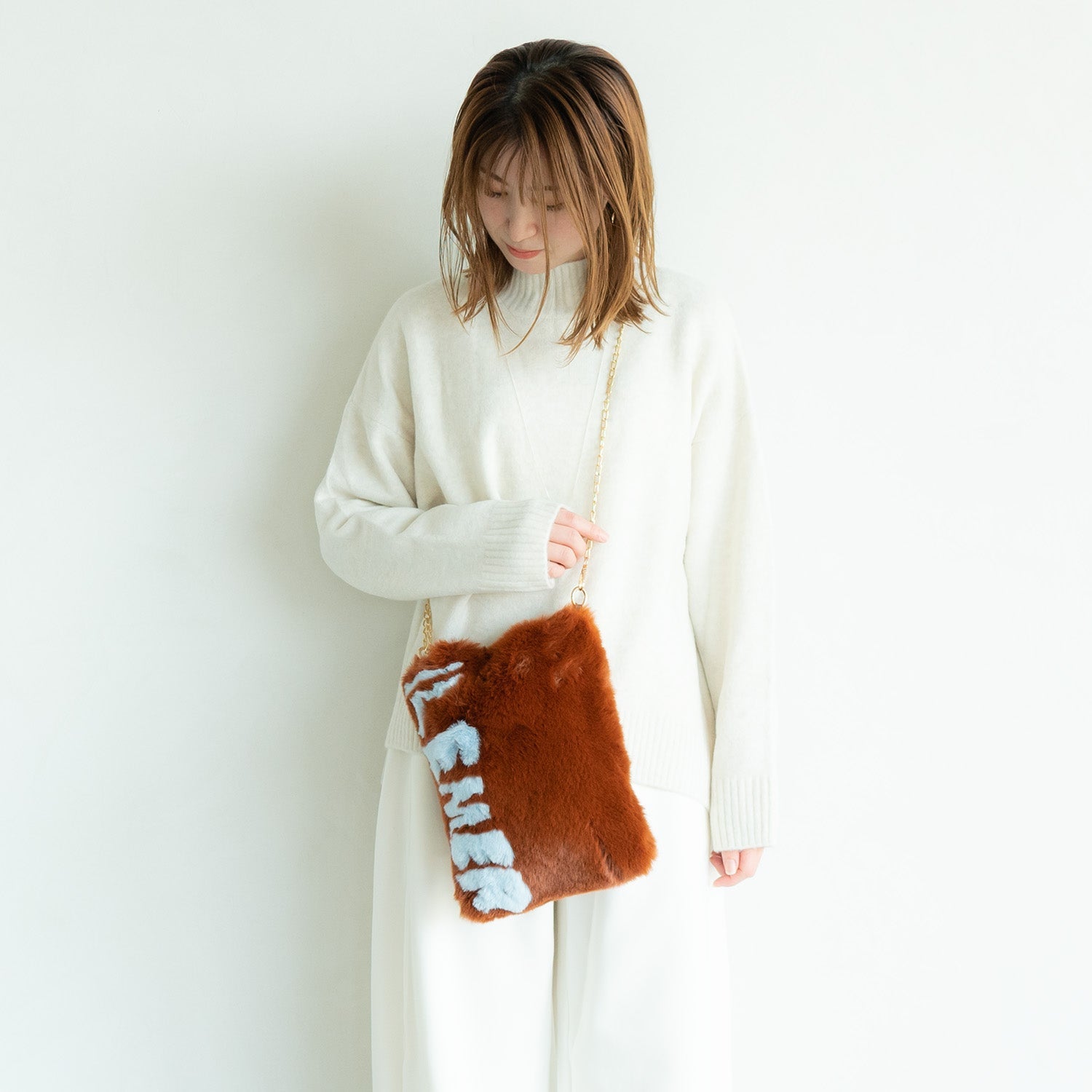 ILEMER(イルメール)(いるめーる)のふっくら厚みのある心地よい肌触りのエコファーバッグ「mofumofu(モフモフ)(もふもふ)」。毛流れによって表情を変える手描きのようなファーならではの味わい深いブランドロゴがチャーミングなファーバッグ。カラーはビターな見た目とは裏腹に甘さたっぷりのブラウニーのような【テラコッタ×サックス】にほろ苦く甘いカラメルソースのような【マスタード×テラコッタ】の二色展開。