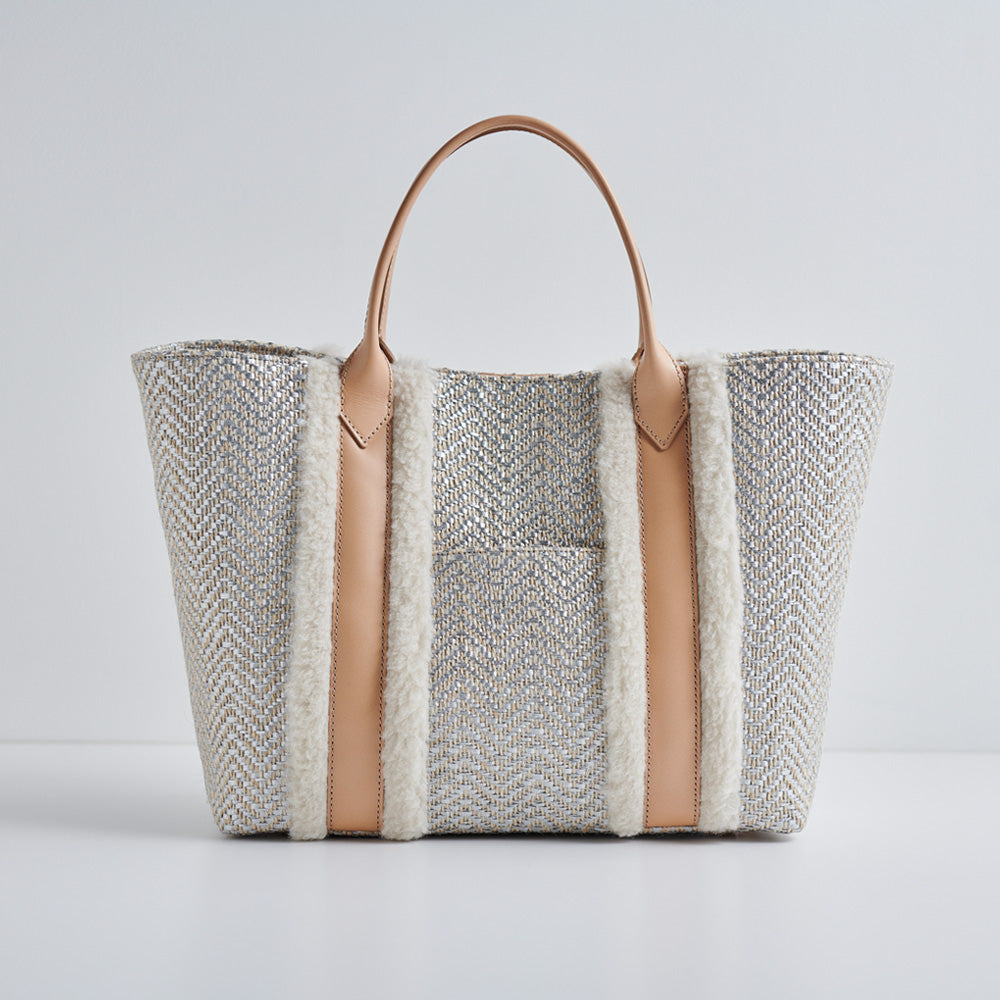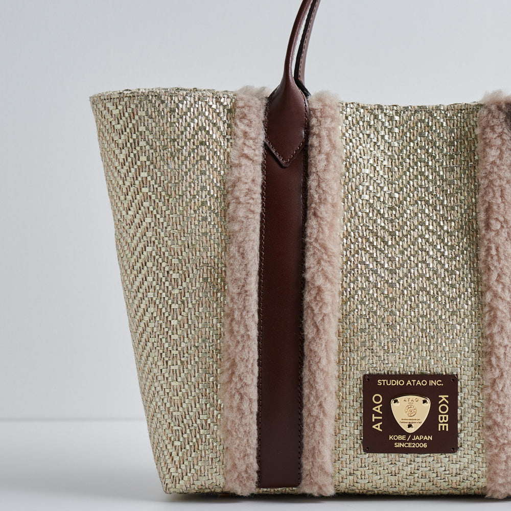 京都の職人が編み込んだ、ヘリンボーン柄のジュートバッグ「shiki」。ジュート素材に加え、心地よい優しい手触りのウール素材に、レザーのハンドルを組み合わせているので、シーズンレスでご使用いただけます。素材から縫製まで全て日本メーカーで育てた春夏秋冬お楽しみいただけるトートバッグです。カラーはハイニッケルの金具を使用したプラチナに、ゴールドの2色展開。ATAO(アタオ)(あたお)(トートバッグ)(ジュート素材)(麻)(軽量)(ハンドバッグ)(シキ)(shiki)(四季)(羊毛)(ウール)